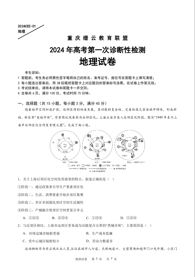 重庆缙云教育联盟2024届高三高考第一次诊断性检测(一模)地理