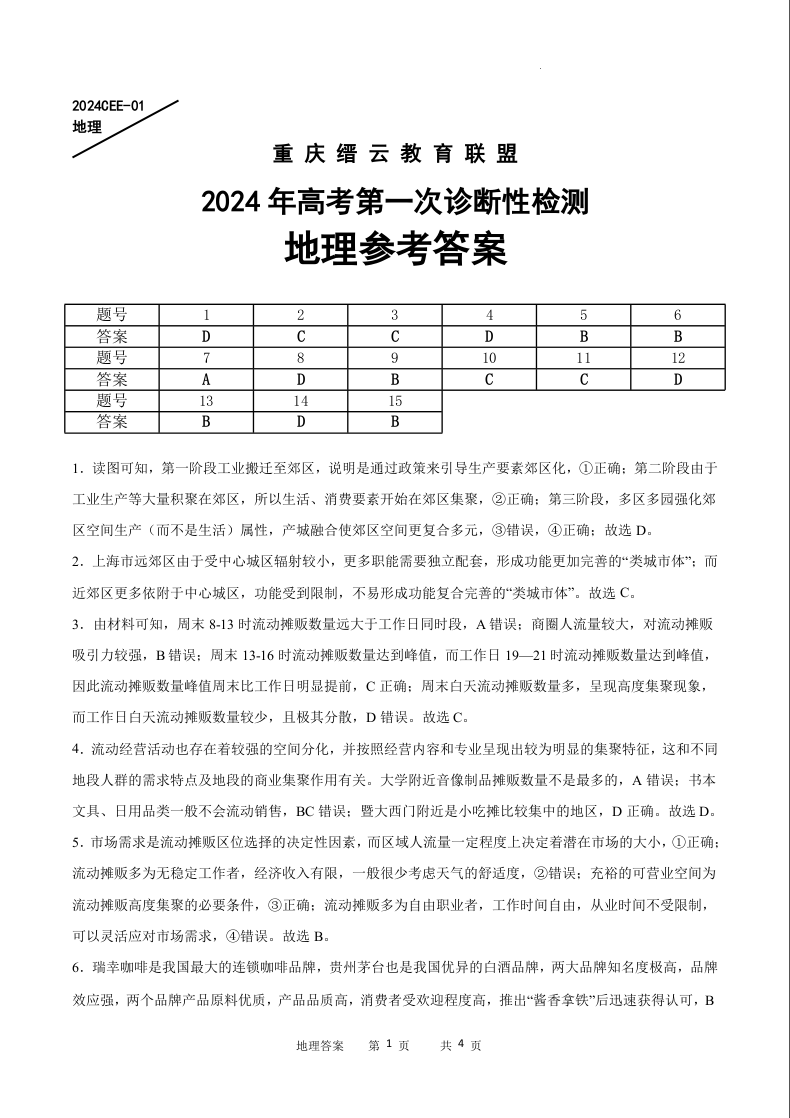 重庆缙云教育联盟2024届高三高考第一次诊断性检测(一模)地理答案
