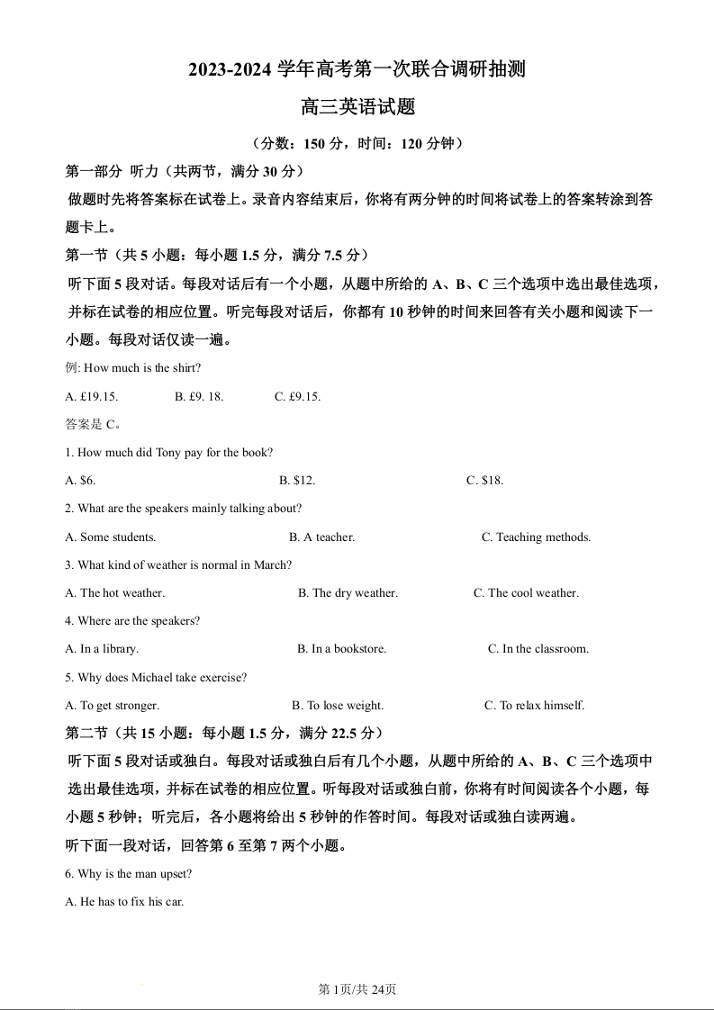 重庆市乌江2024届新高考协作体高三上学期第一次联合调研抽测(一模)英语(精品解析版)