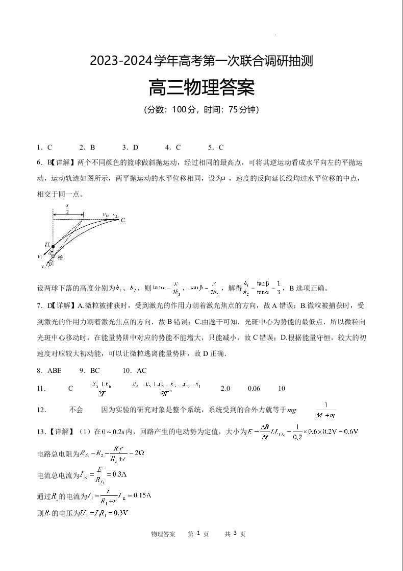 重庆市乌江2024届新高考协作体高三上学期第一次联合调研抽测(一模)物理答案
