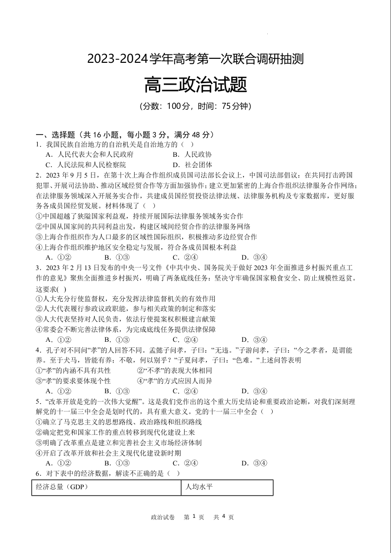 重庆市乌江2024届新高考协作体高三上学期第一次联合调研抽测(一模)政治