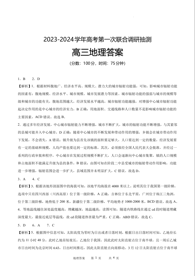 重庆市乌江2024届新高考协作体高三上学期第一次联合调研抽测(一模)地理答案