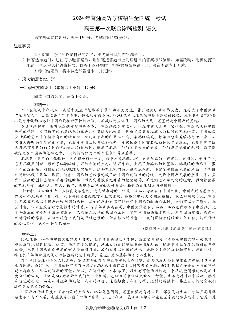 重庆一诊康德卷2024年普通高等学校招生全国统一考试高三第一次联合诊断检测语文