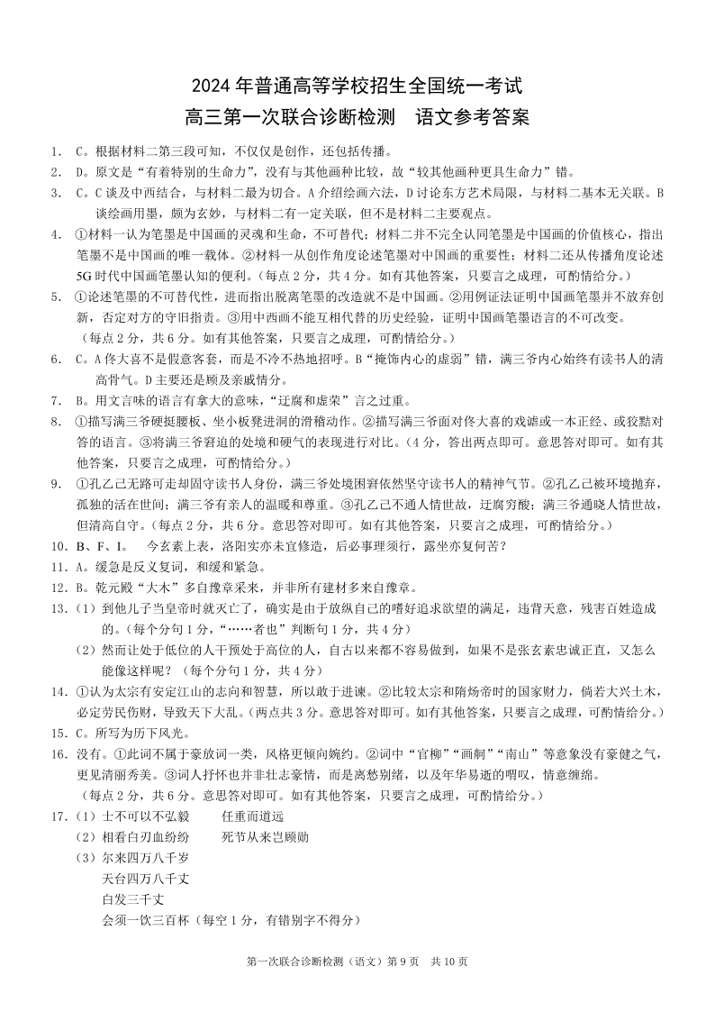 重庆一诊康德卷2024年普通高等学校招生全国统一考试高三第一次联合诊断检测语文答案