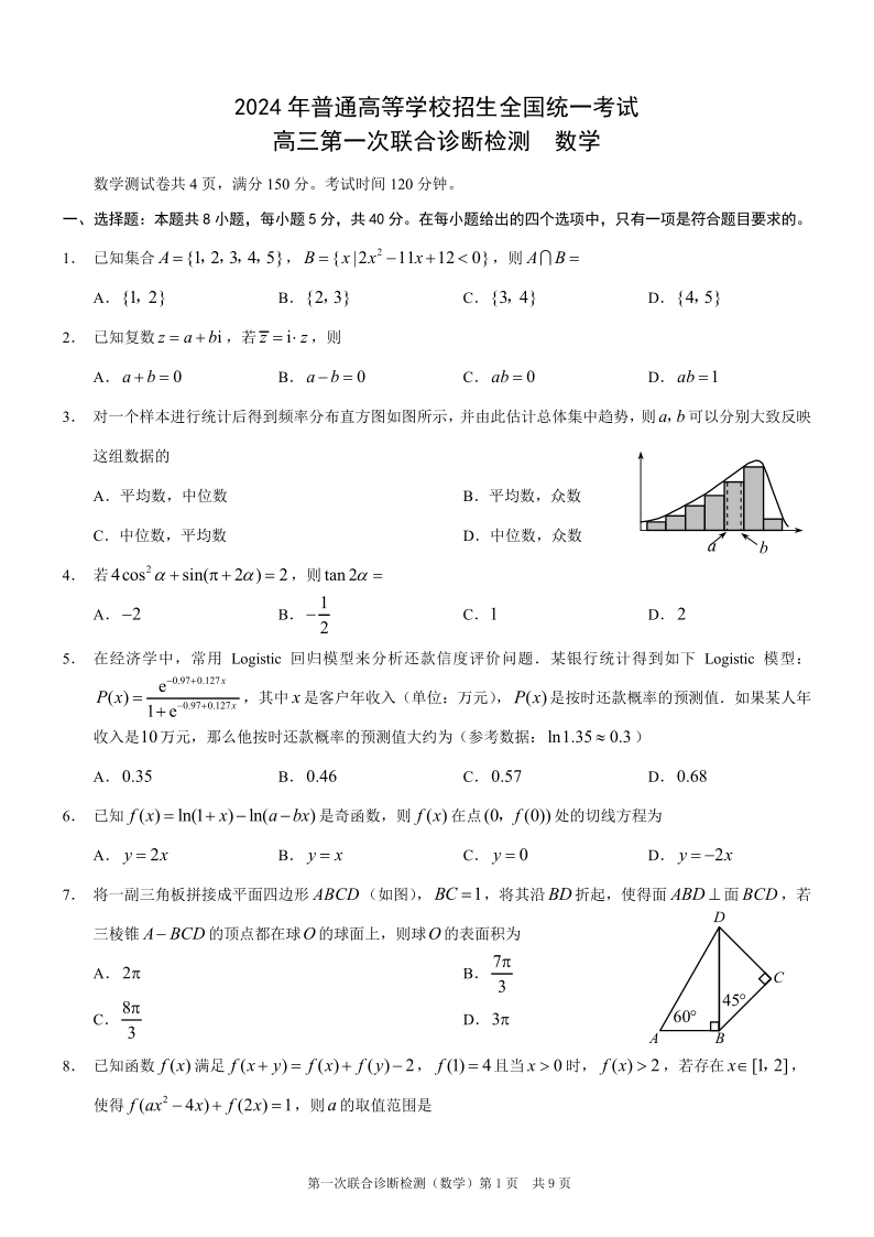 重庆一诊康德卷2024年普通高等学校招生全国统一考试高三第一次联合诊断检测数学