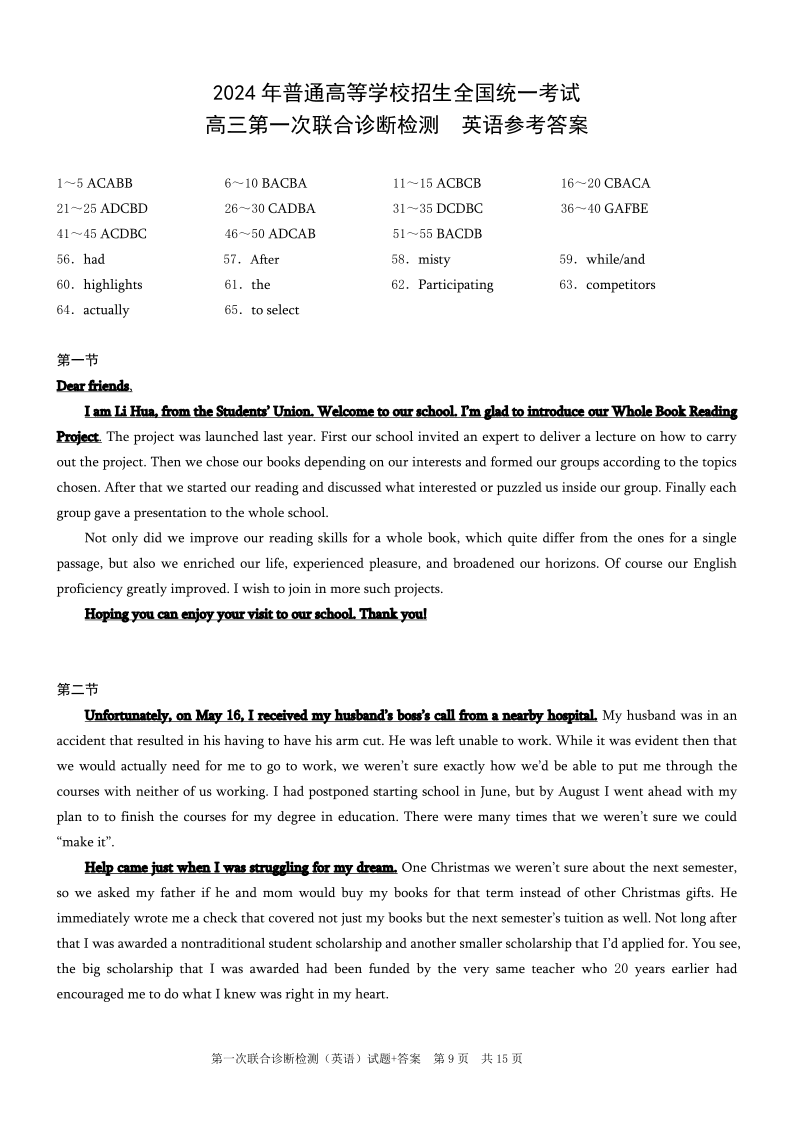 重庆一诊康德卷2024年普通高等学校招生全国统一考试高三第一次联合诊断检测英语答案