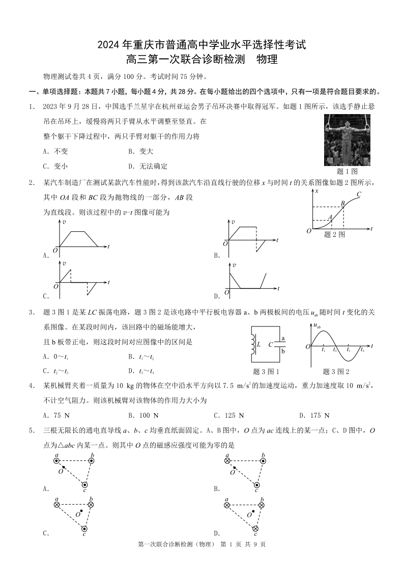 重庆一诊康德卷2024年普通高等学校招生全国统一考试高三第一次联合诊断检测物理