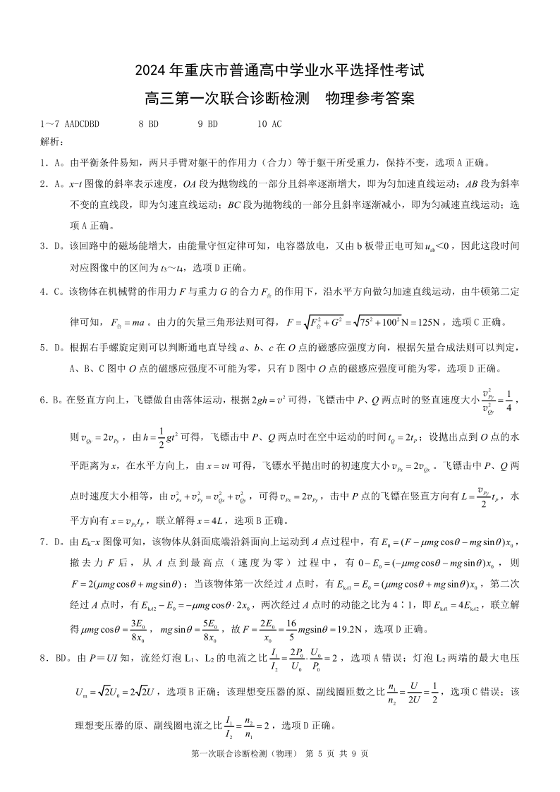 重庆一诊康德卷2024年普通高等学校招生全国统一考试高三第一次联合诊断检测物理答案