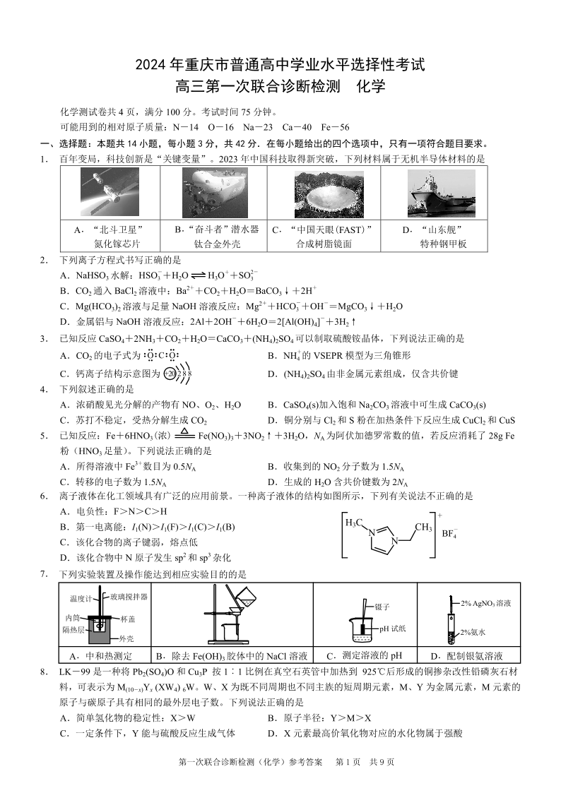 重庆一诊康德卷2024年普通高等学校招生全国统一考试高三第一次联合诊断检测化学