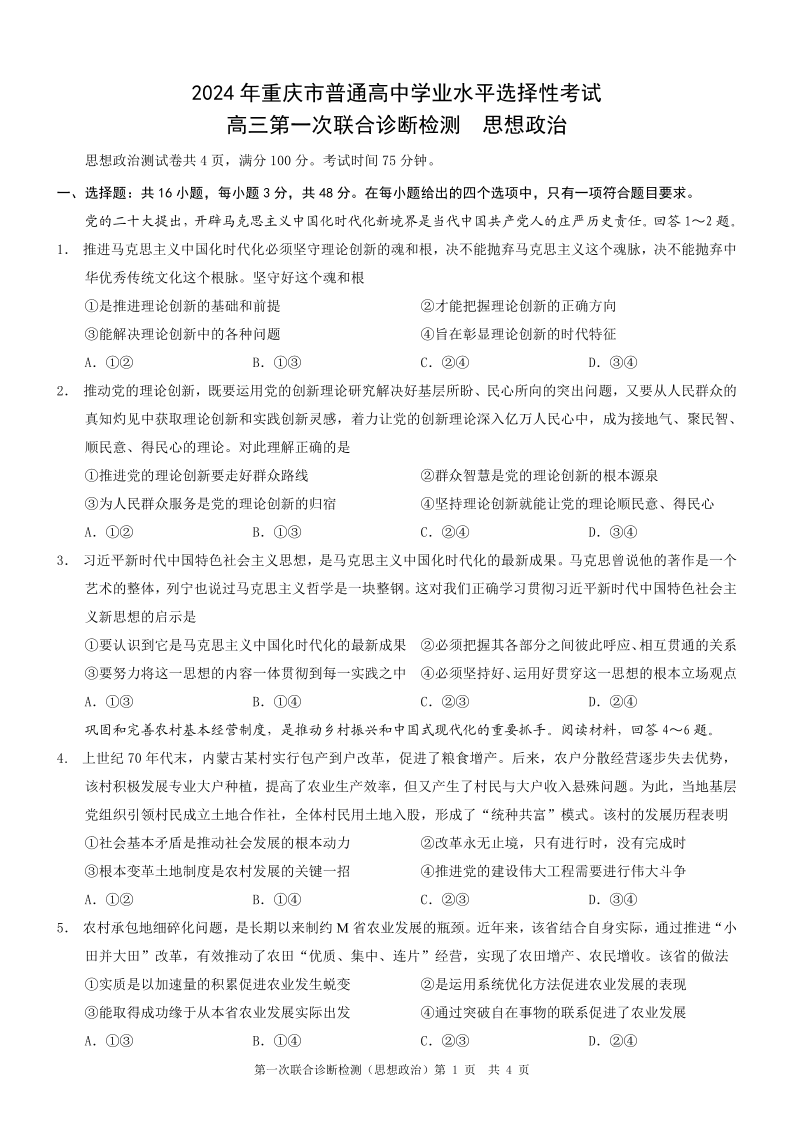重庆一诊康德卷2024年普通高等学校招生全国统一考试高三第一次联合诊断检测政治
