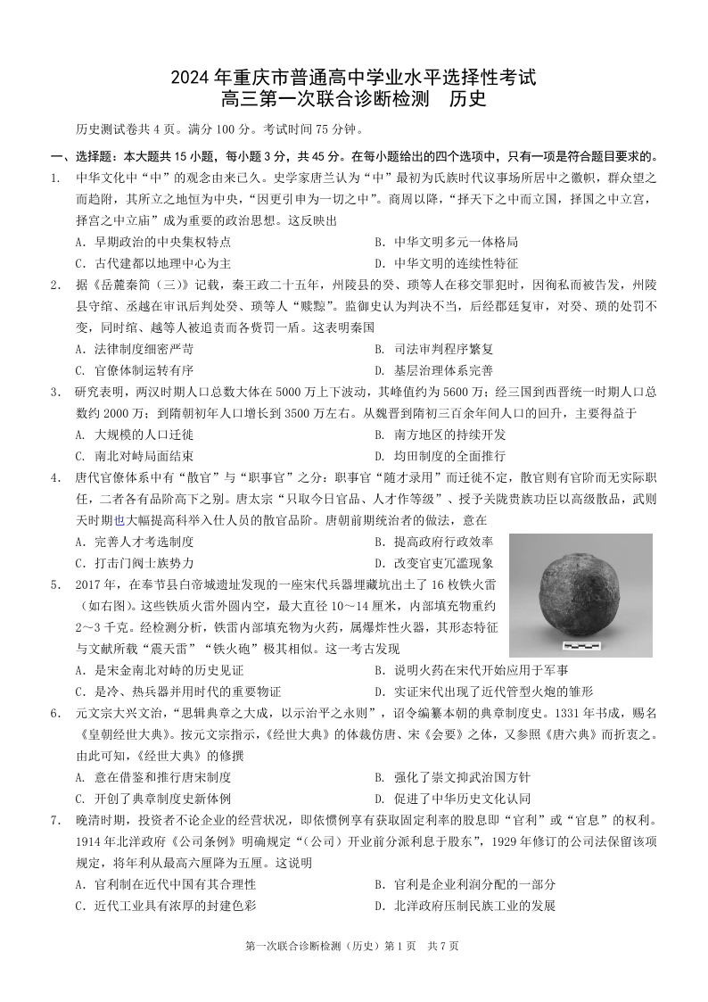 重庆一诊康德卷2024年普通高等学校招生全国统一考试高三第一次联合诊断检测历史