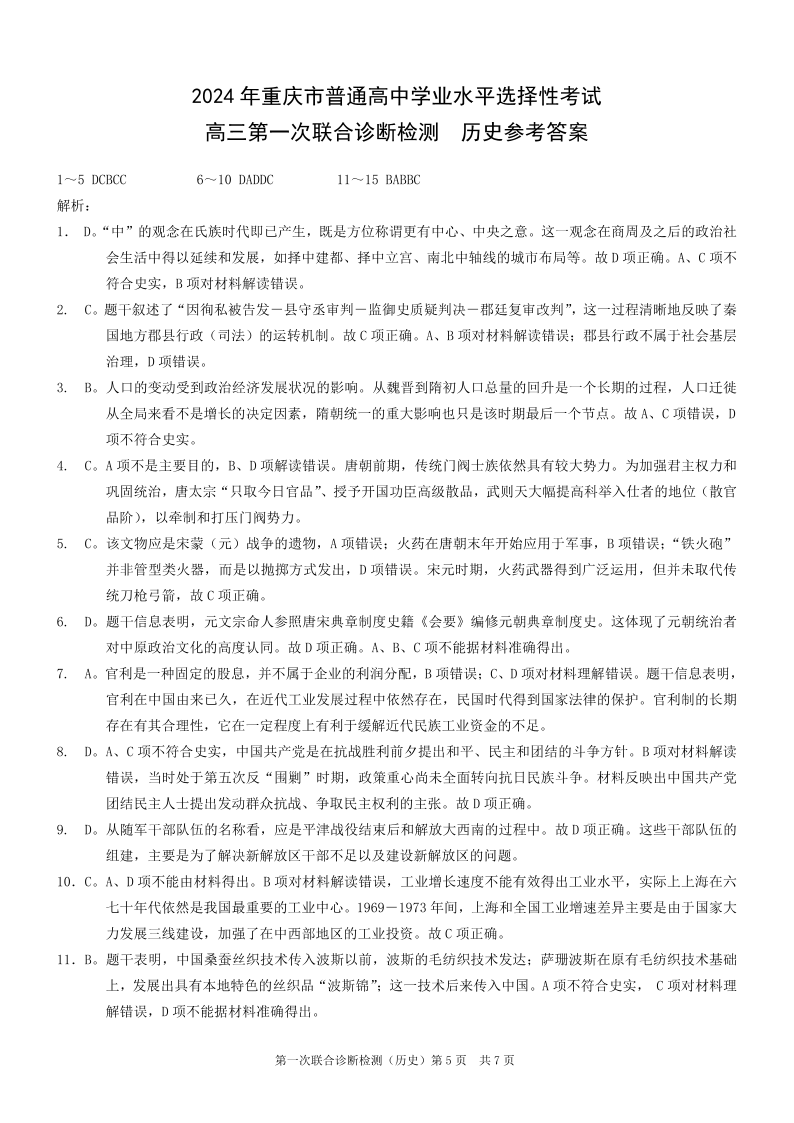 重庆一诊康德卷2024年普通高等学校招生全国统一考试高三第一次联合诊断检测历史答案