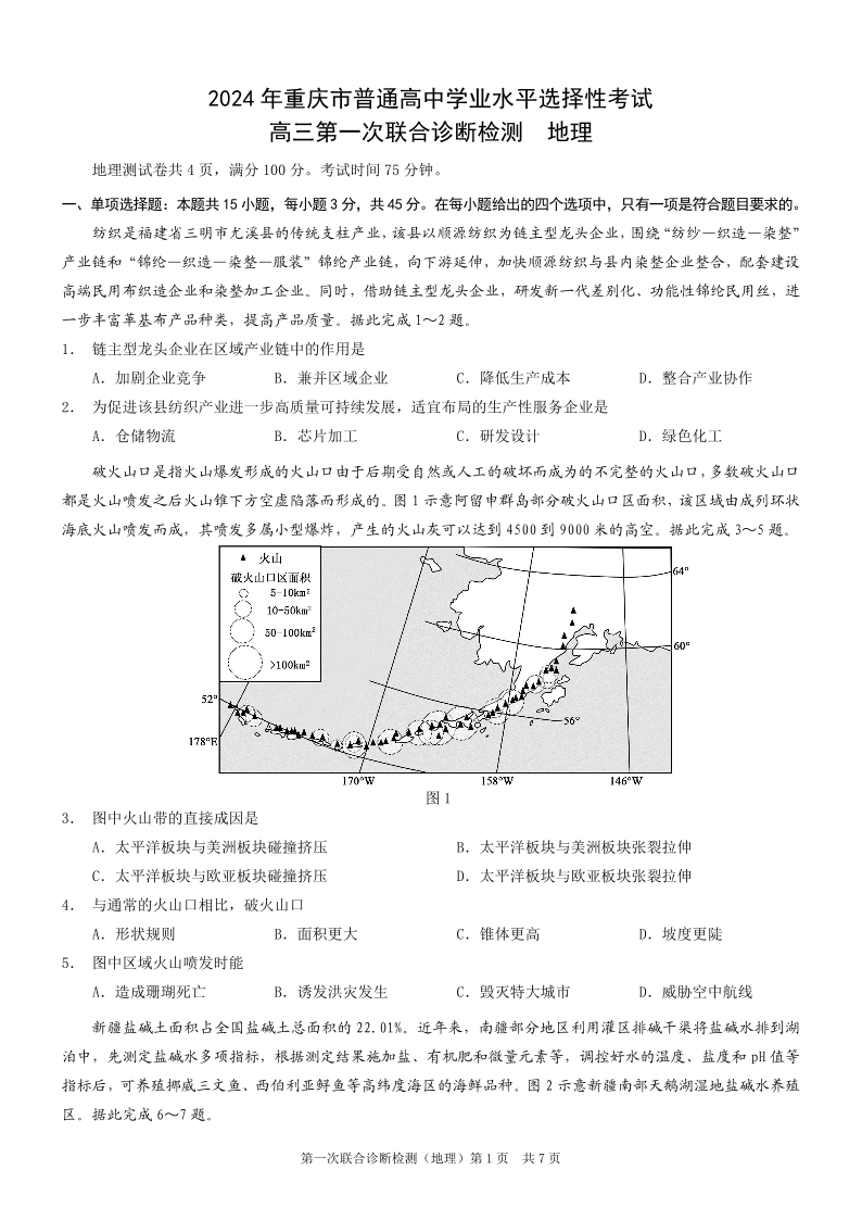 重庆一诊康德卷2024年普通高等学校招生全国统一考试高三第一次联合诊断检测地理