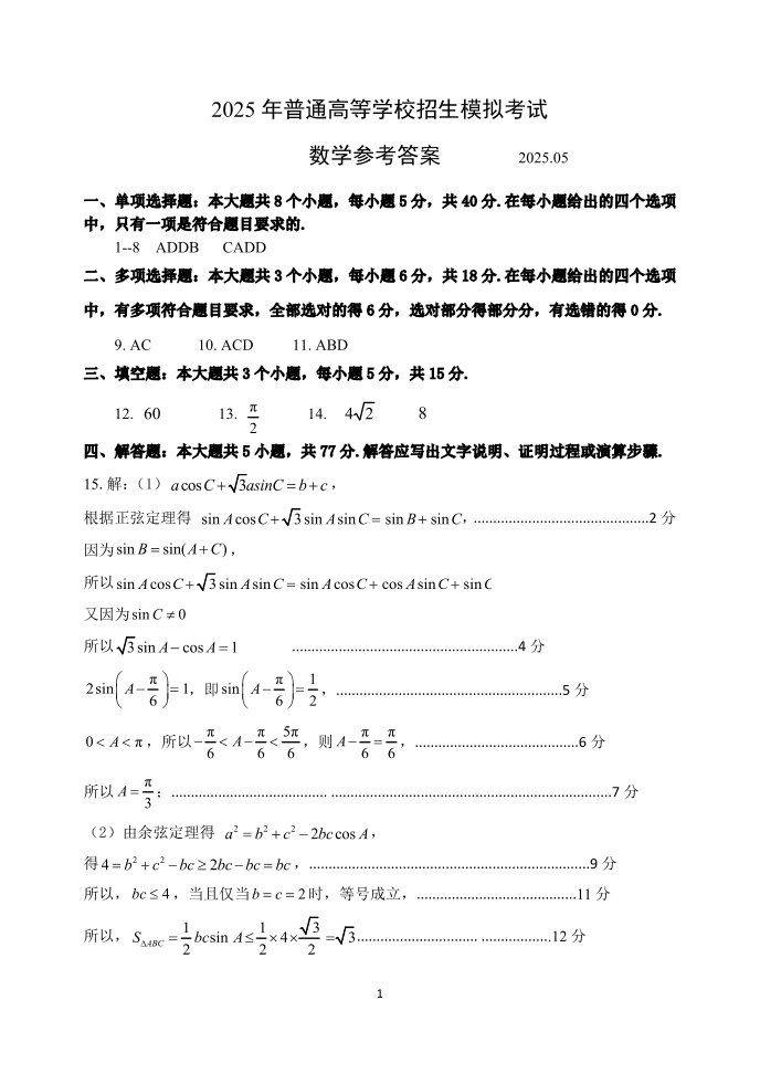 山东省东部2025届下学期6月高三考前热身数学答案