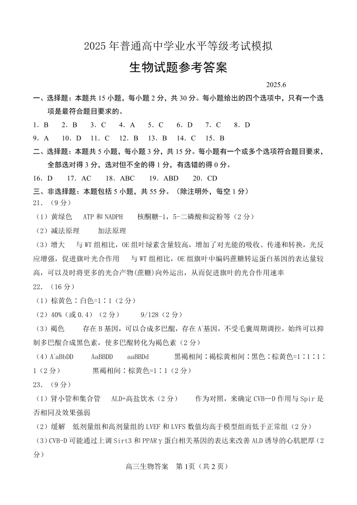 山东省东部2025届下学期6月高三考前热身生物答案
