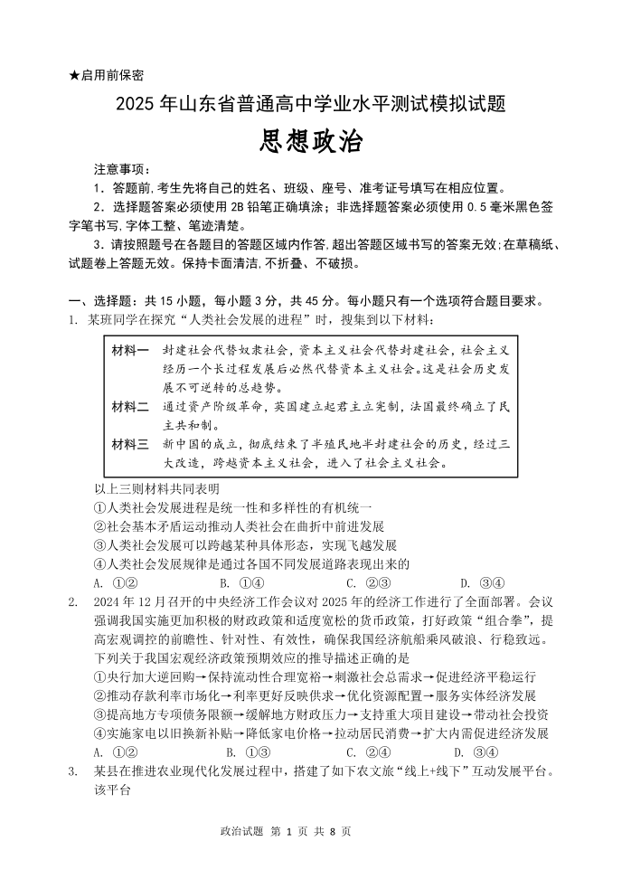 山东省东部2025届下学期6月高三考前热身政治