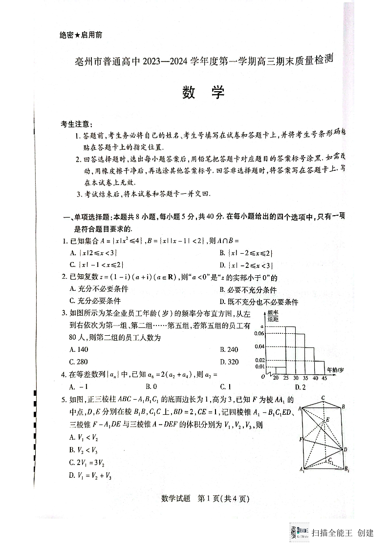 安徽省亳州市普通高中2024届高三上学期1月期末质量检测数学