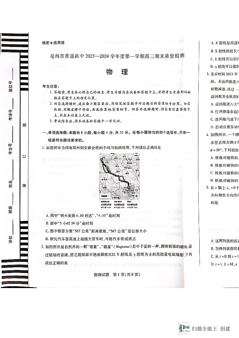 安徽省亳州市普通高中2024届高三上学期1月期末质量检测物理