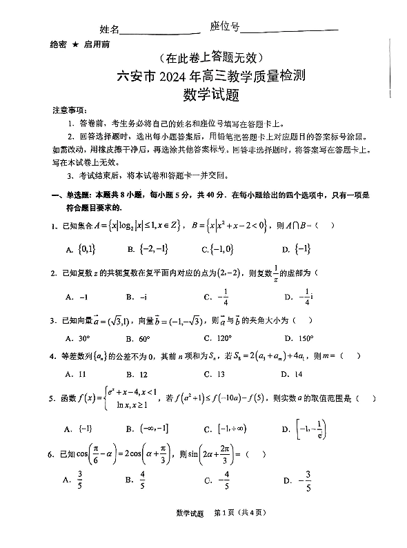 安徽省六安市2024届高三上学期期末教学质量检测数学