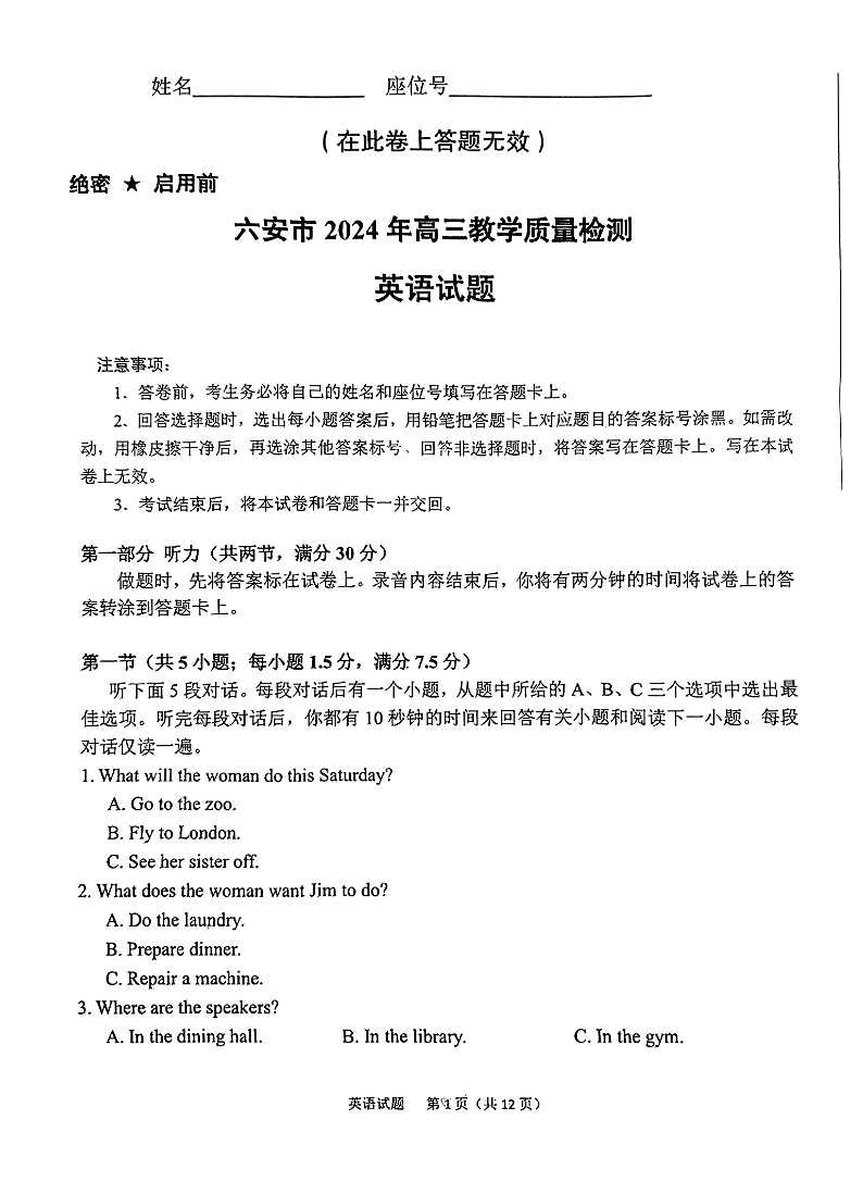 安徽省六安市2024届高三上学期期末教学质量检测英语