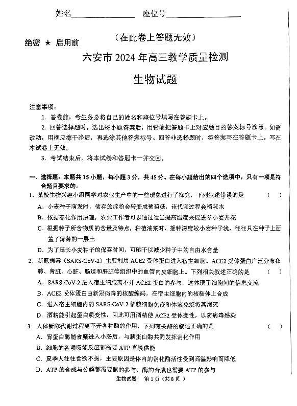 安徽省六安市2024届高三上学期期末教学质量检测生物