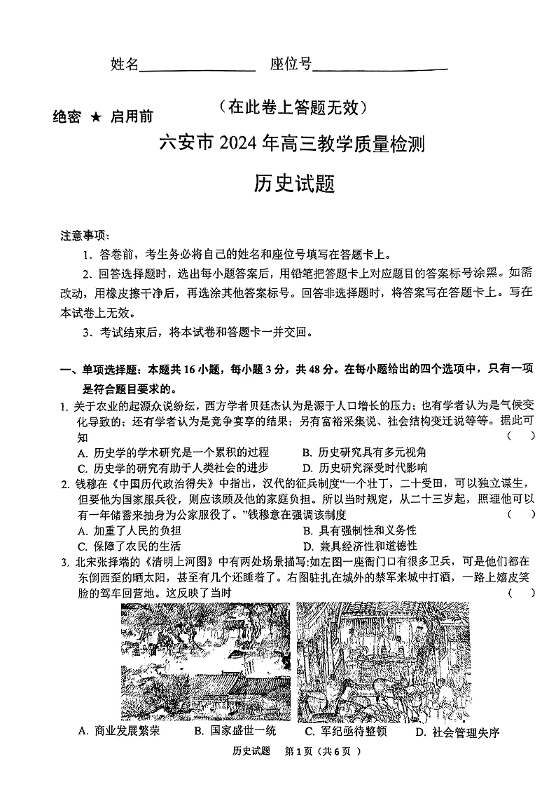 安徽省六安市2024届高三上学期期末教学质量检测历史+答案