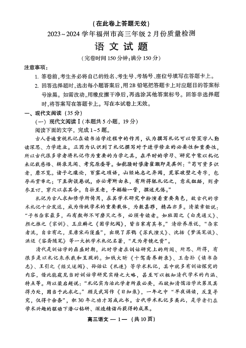 福建省福州市2024届高三下学期2月份质量检测语文