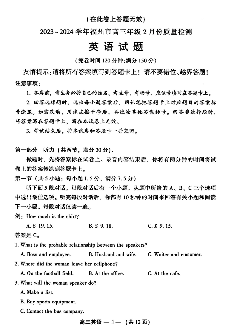 福建省福州市2024届高三下学期2月份质量检测英语