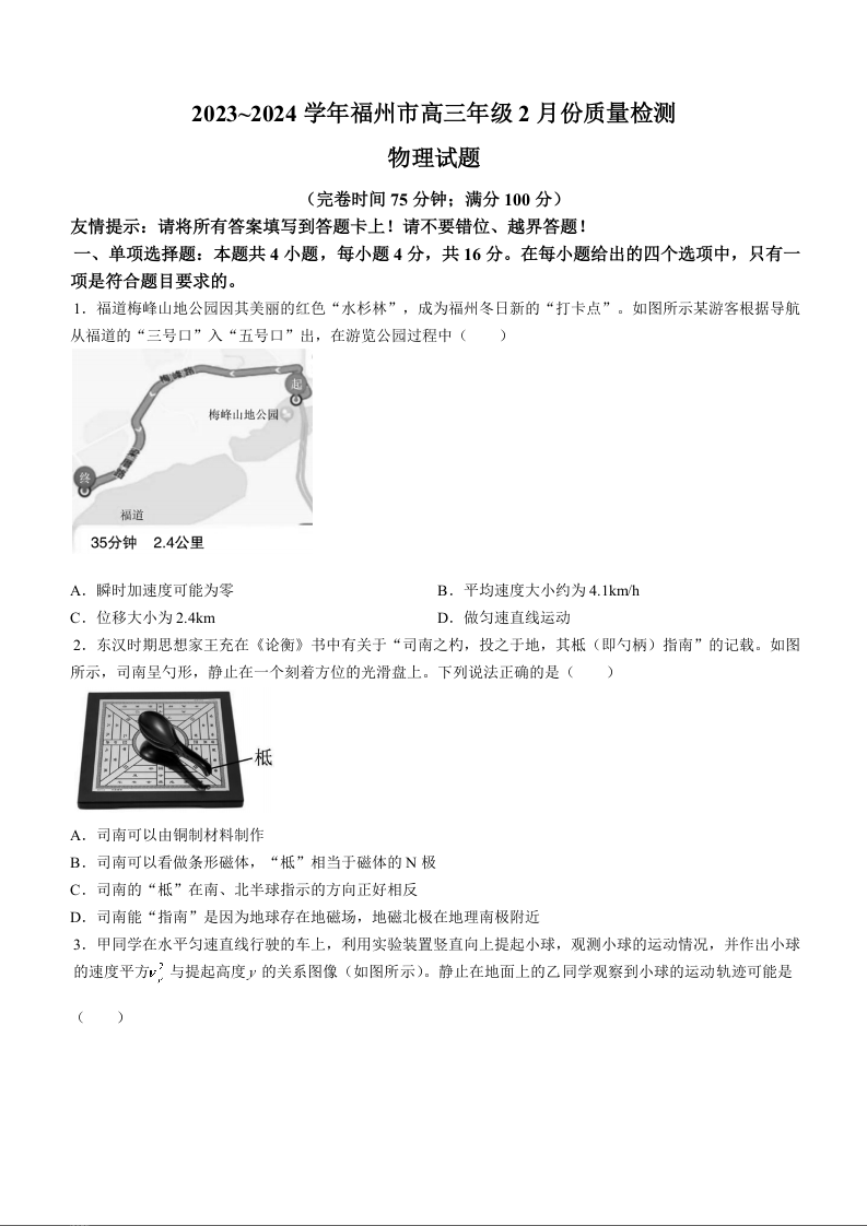 福建省福州市2024届高三下学期2月份质量检测物理+答案