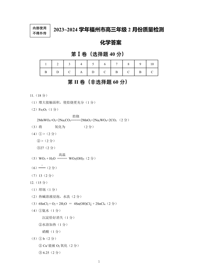 福建省福州市2024届高三下学期2月份质量检测化学答案