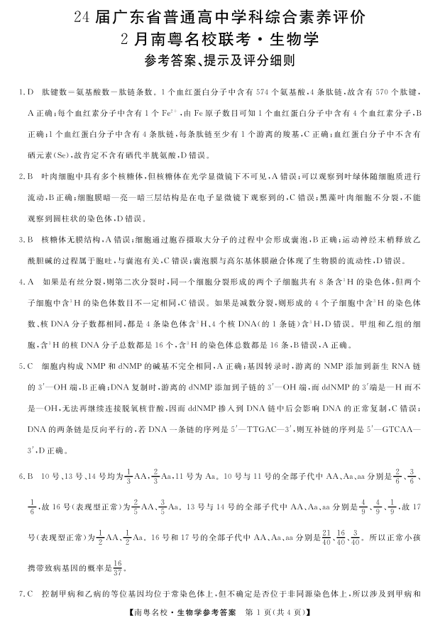 广东省南粤名校2024届高三下学期2月联考生物答案
