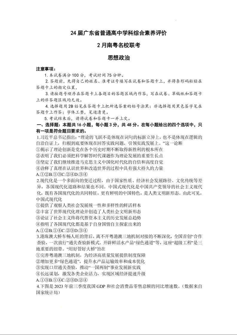 广东省南粤名校2024届高三下学期2月联考政治+答案