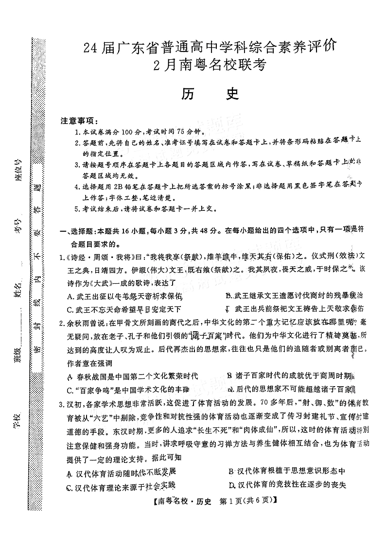 广东省南粤名校2024届高三下学期2月联考历史