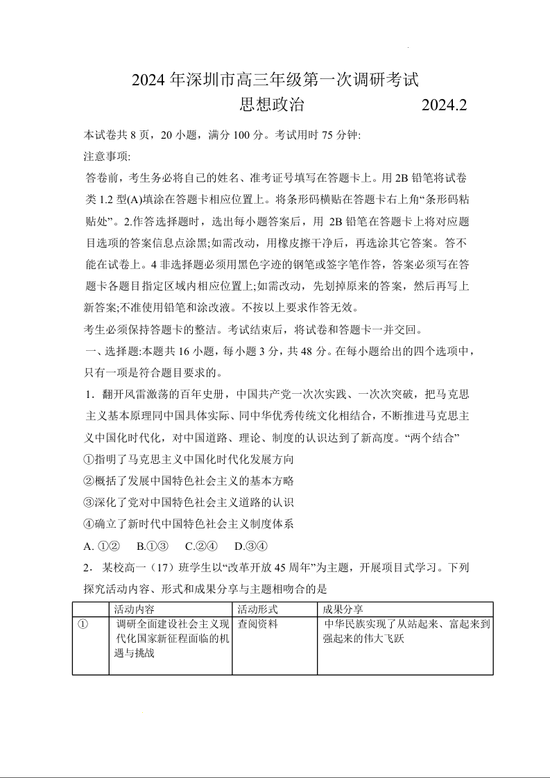 广东省深圳市2024届高三一模考试政治