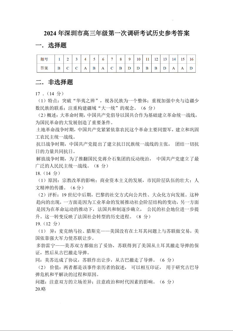 广东省深圳市2024届高三一模考试历史答案