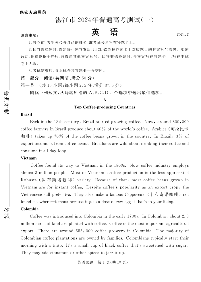 广东省湛江市2024届普通高考第一次模拟考试(湛江一模)英语