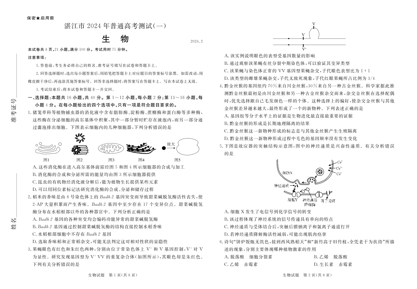 广东省湛江市2024届普通高考第一次模拟考试(湛江一模)生物