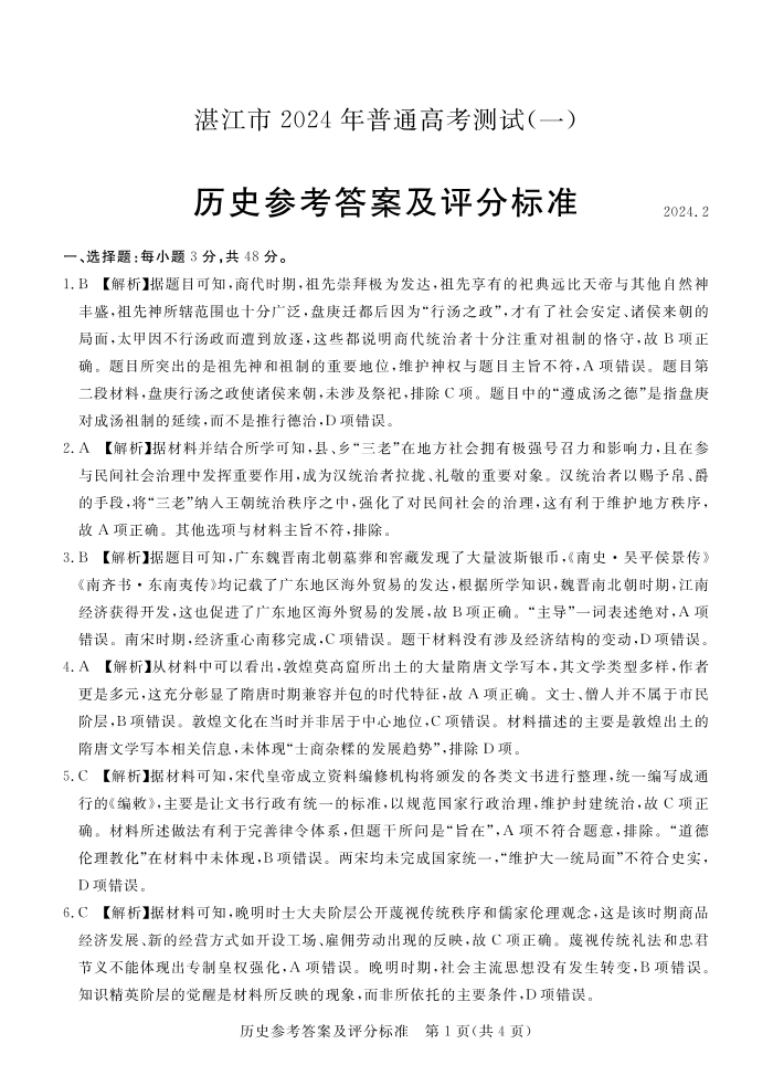 广东省湛江市2024届普通高考第一次模拟考试(湛江一模)历史答案
