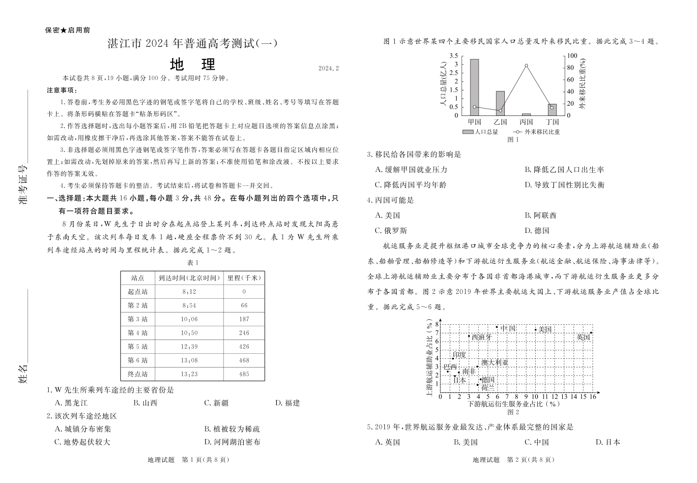 广东省湛江市2024届普通高考第一次模拟考试(湛江一模)地理