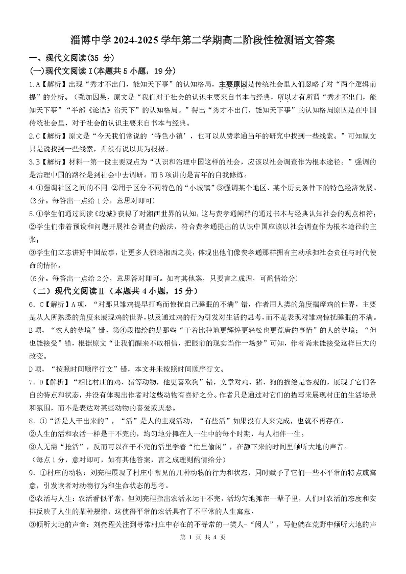 山东省淄博市张店区域2024-2025学年下学期4月高二检测语文答案