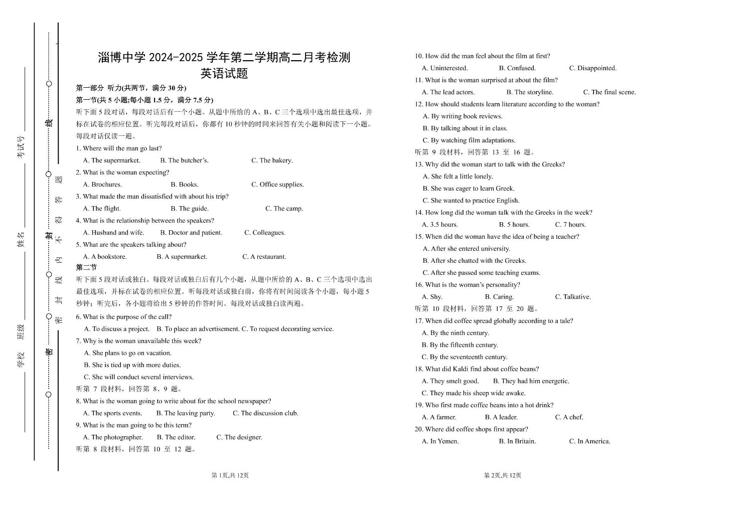 山东省淄博市张店区域2024-2025学年下学期4月高二检测英语