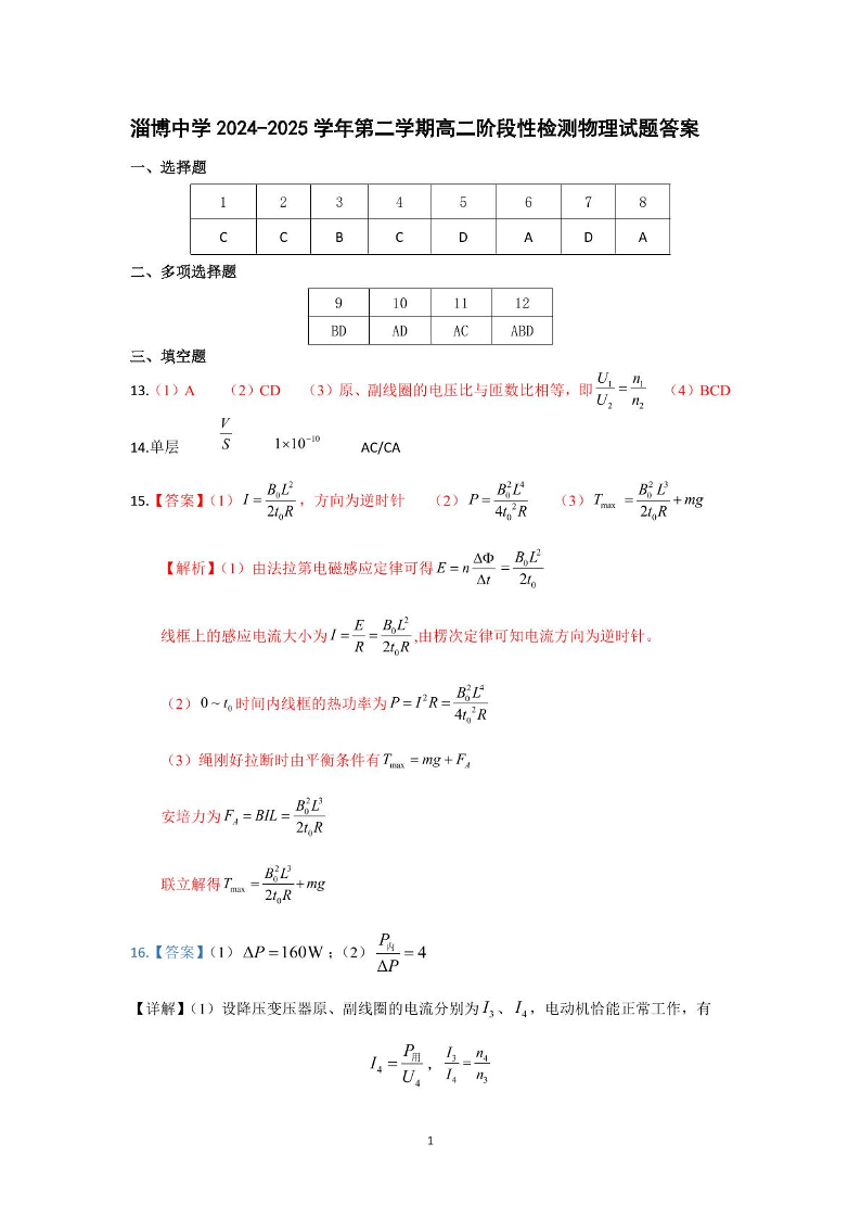 山东省淄博市张店区域2024-2025学年下学期4月高二检测物理答案