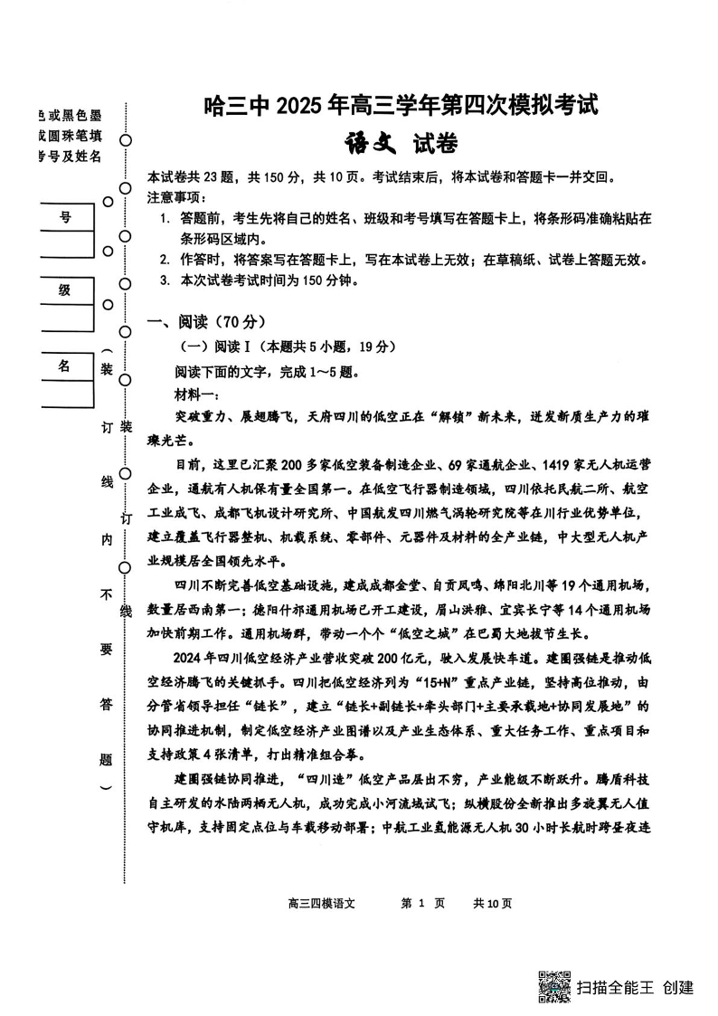 黑龙江省哈三中2025届高三第四次模拟考试语文