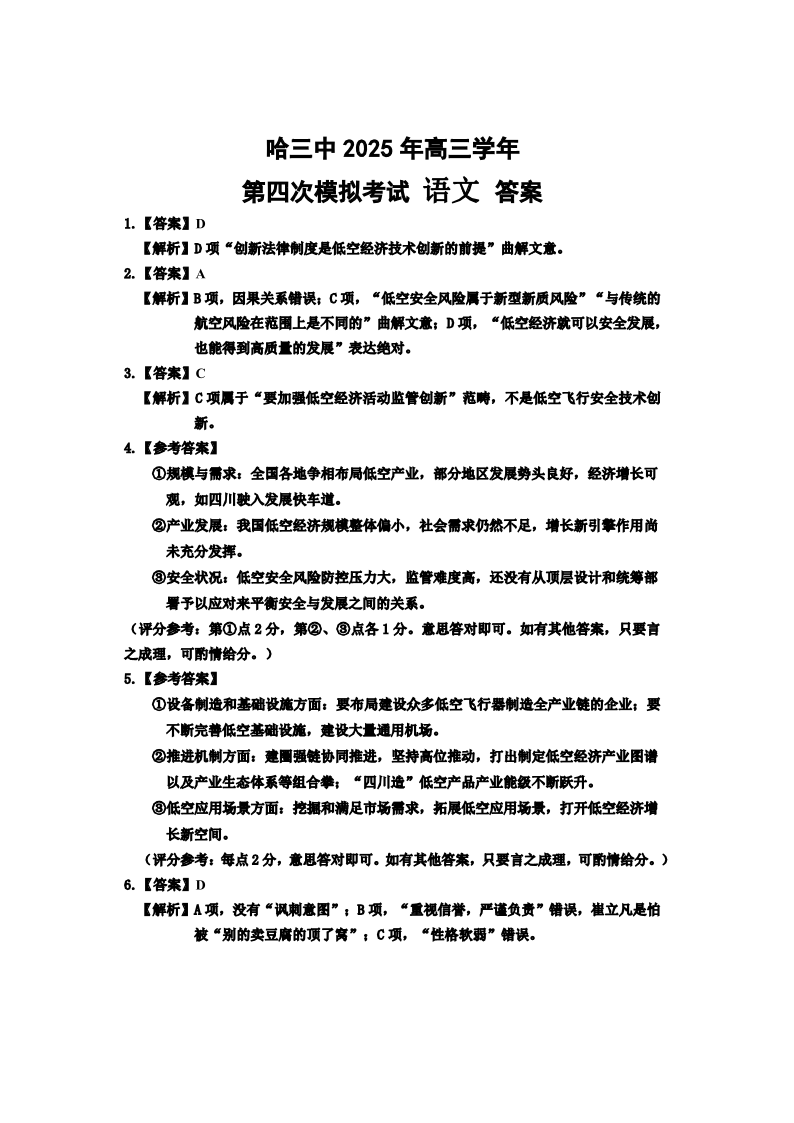 黑龙江省哈三中2025届高三第四次模拟考试语文答案