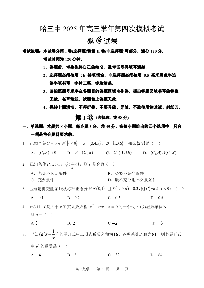 黑龙江省哈三中2025届高三第四次模拟考试数学