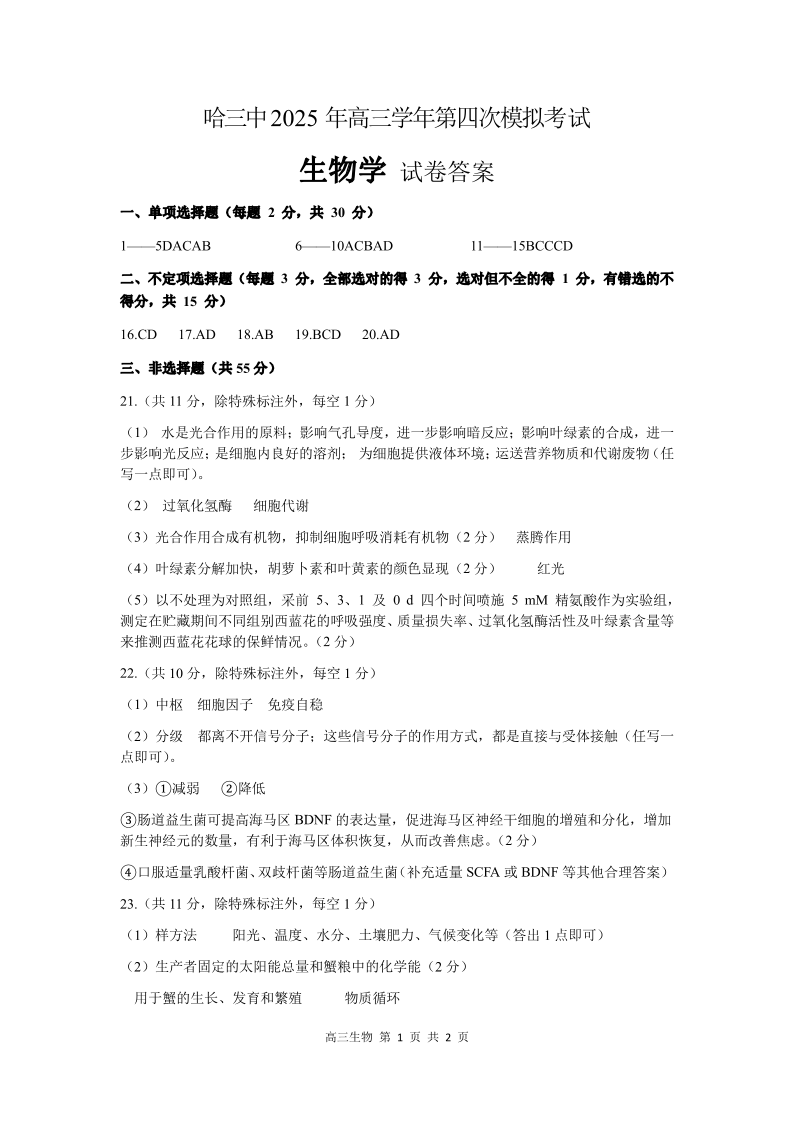 黑龙江省哈三中2025届高三第四次模拟考试生物答案