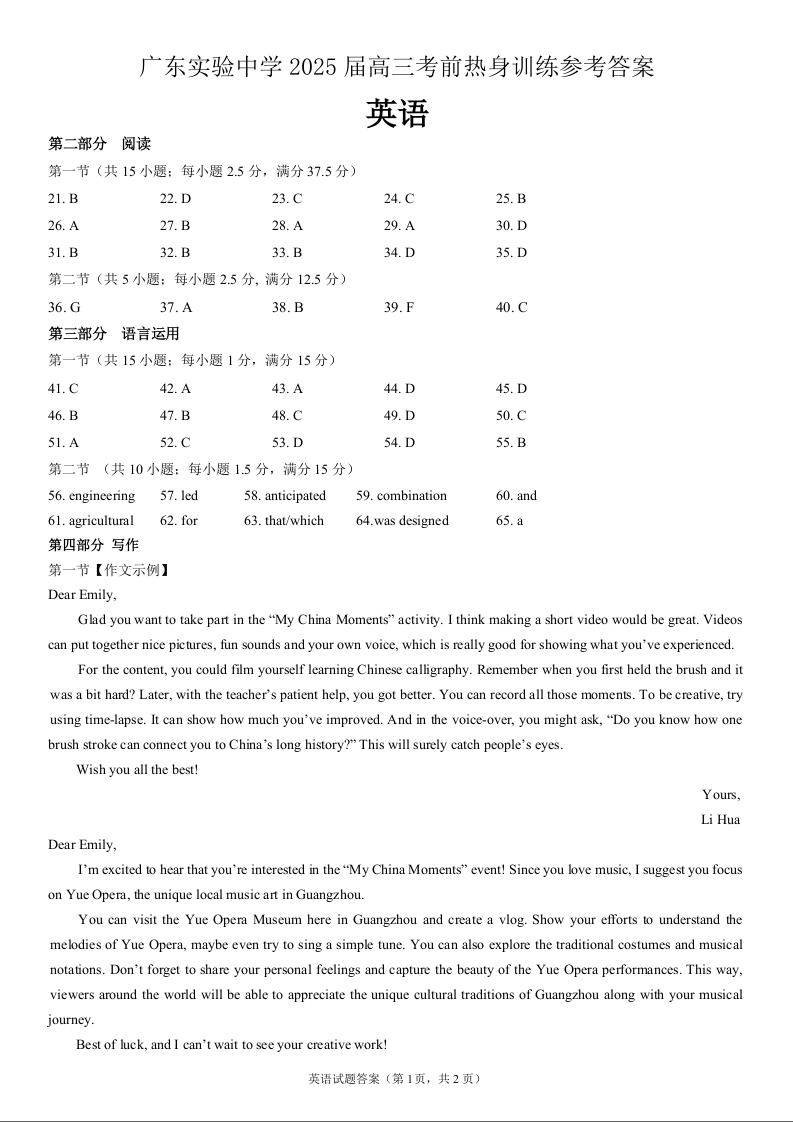 广东省实验中学2025届下学期高考前热身训练英语答案