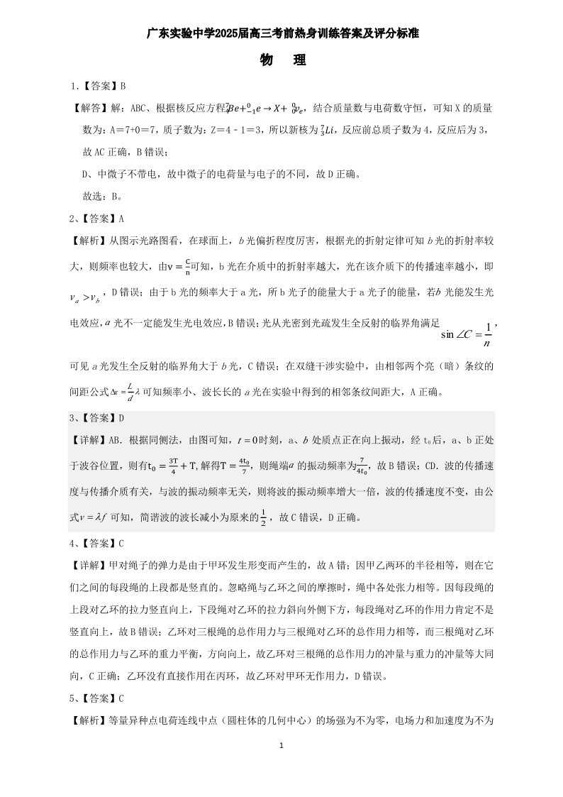 广东省实验中学2025届下学期高考前热身训练物理答案