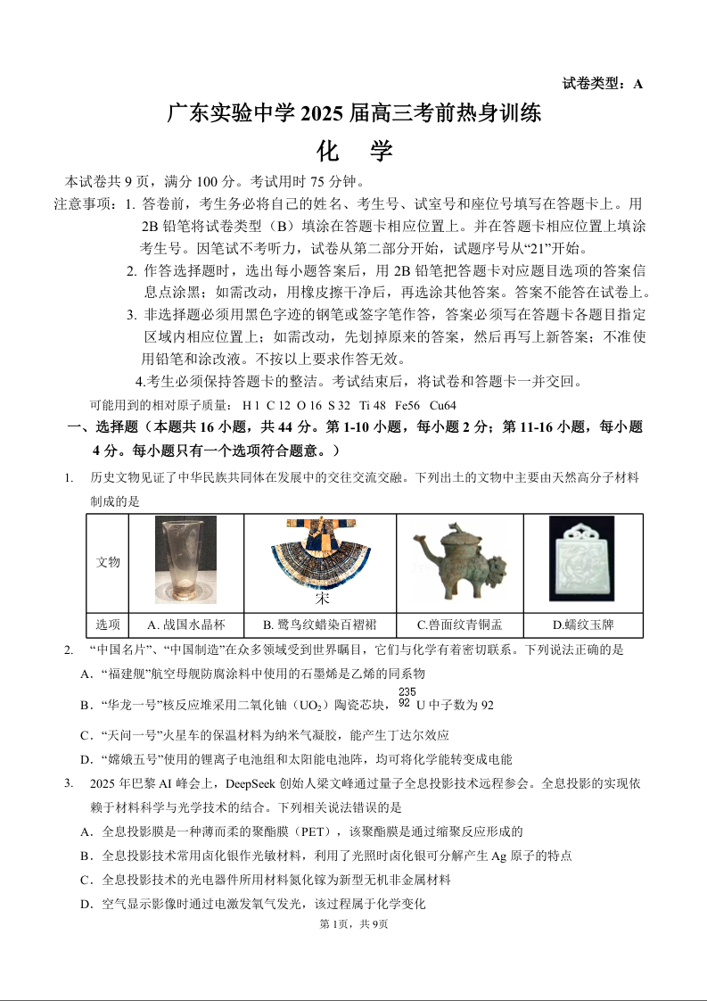 广东省实验中学2025届下学期高考前热身训练化学