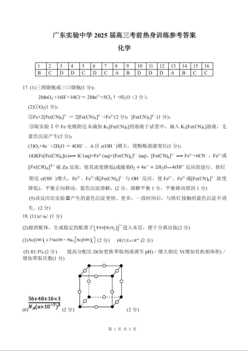 广东省实验中学2025届下学期高考前热身训练化学答案
